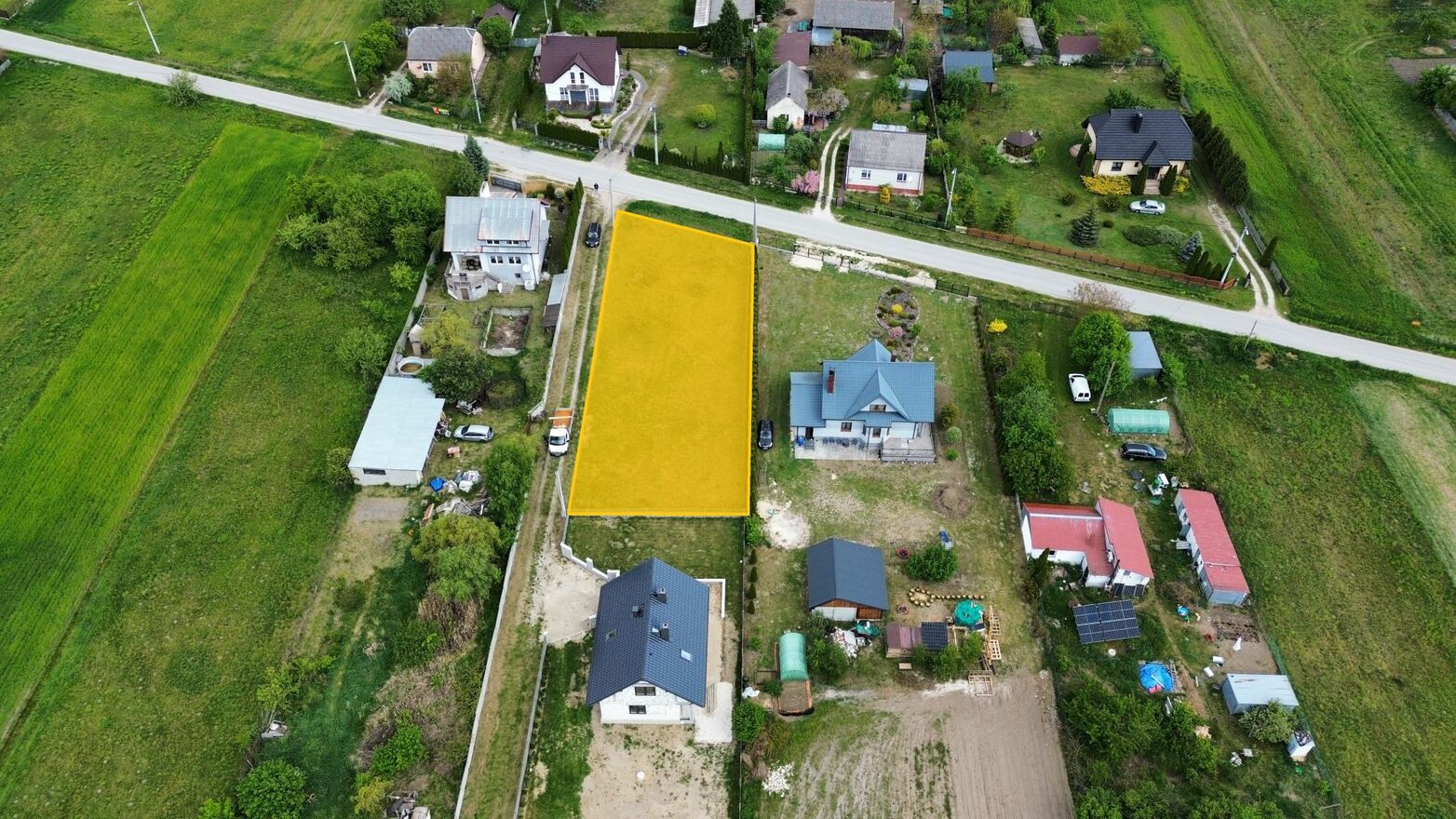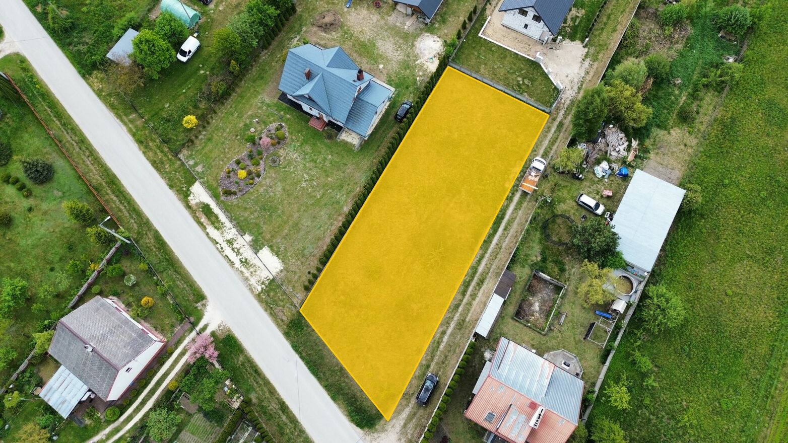 Działka jest płaska z lekkim nachyleniem od strony jezdni. Niezagospodarowana, ogrodzona z dwóch stron. Porośnięta trawą. W sąsiedztwie nowa zabudowa mieszkaniowa jednorodzinna. Działka nie jest objęta MPZP. Możliwość wystąpienia o wydanie warunków zabudowy. Numer działki 653/1.